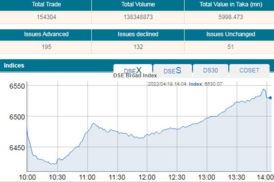 DSEX, the prime index of the Dhaka Stock Exchange, went up by 20.87 points or 0.31 per cent to settle at 6,683. DSEX added 201 points in the past four consecutive sessions.