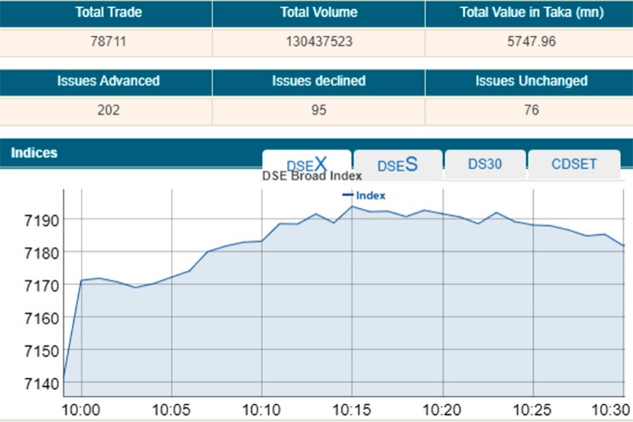 After crossing the prime index 7,000-mark, DSEX, the prime index of the Dhaka Stock Exchange (DSE), soared 45.89 points or 0.64 per cent to stand at 7,186 points within the first 30 minutes of trading at 10:30 am – the highest since its inception in 2013.