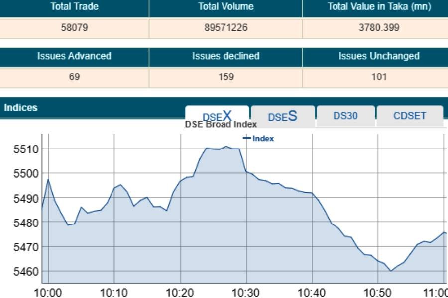 DSEX, the prime index of the DSE, went down by 6.30 points or 0.11 per cent to stand 5,478 points till then.