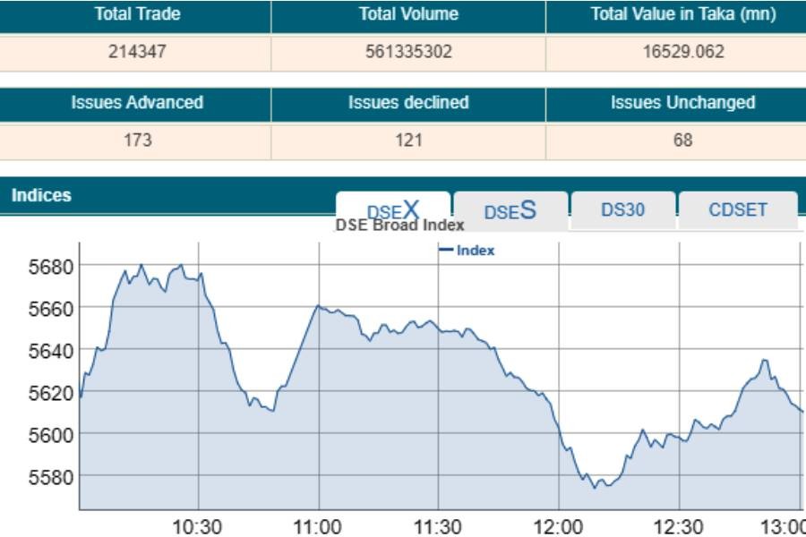DSEX, the prime index of the DSE, went down by 13.88 points or 0.24 per cent to stand 5,605 points.