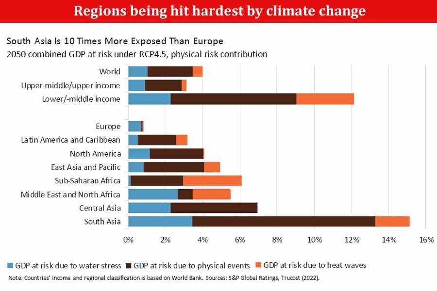 Bangladesh, India, Pakistan and Sri Lanka's exposure to wildfires, floods, major storms and also water shortages mean South Asia has 10 per cent-18 per cent of GDP at risk, roughly treble that of North America and 10 times more than the least-affected region, Europe.