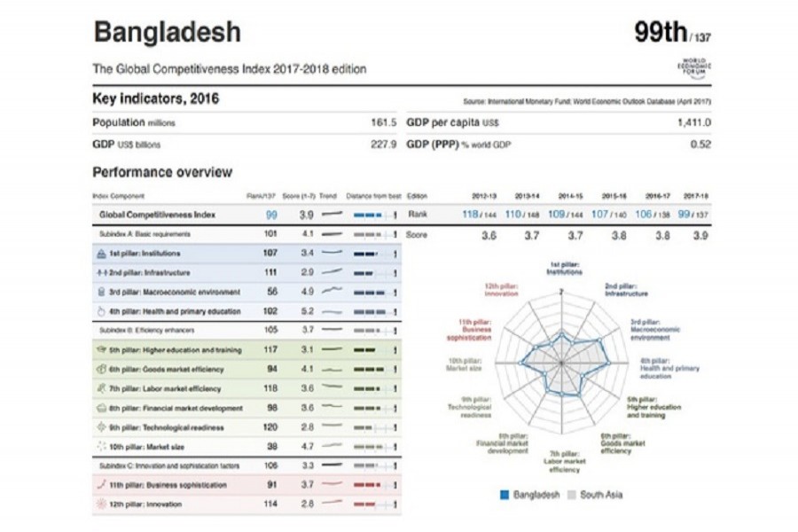 The findings came in the latest Global Competitiveness Report (2017-18) of the World Economic Forum (WEF), released in Dhaka Wednesday.