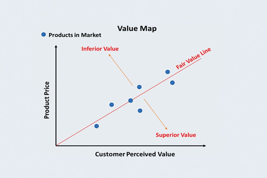 It is important that firms carry out customer value analyses to make sure that they are positioned in their market to return as much value as possible. Customer value analysis is usually based on investigating the relationship between price and the benefits or value of the product to the customer. This is accomplished by constructing a graph that plots price against what the customers perceive are the value of the products in the market and then drawing a line which represents the average relationship between price and value.