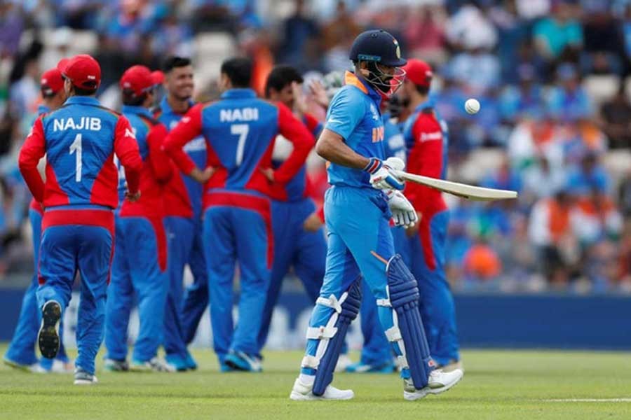 Twice champions India struggled against Afghanistan's disciplined bowling and posted a below-par 224 for eight in a group stage match of the Cricket World Cup at Hampshire Bowl on Saturday.