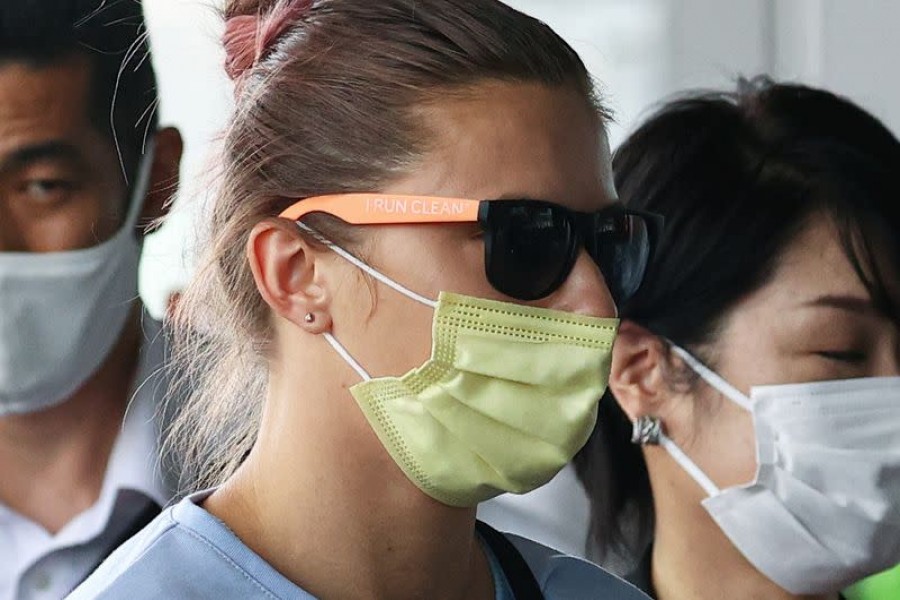 Masked and wearing blue jeans, a blue blouse and sunglasses with "I RUN CLEAN" written on them, Tsimanouskaya had arrived in a police-escorted van at Narita airport east of the Japanese capital. She did not speak to several dozen waiting reporters as she went to a VIP area, escorted by several officials rolling her suitcases, and later to her gate.