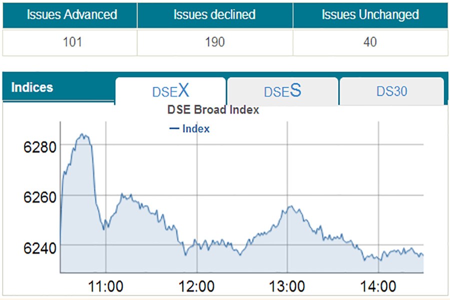 DSEX, the benchmark index of the DSE which replaced the DGEN in four and a half years back, settled at 6,236 after losing 4.63 points or 0.07 per cent over the previous session.