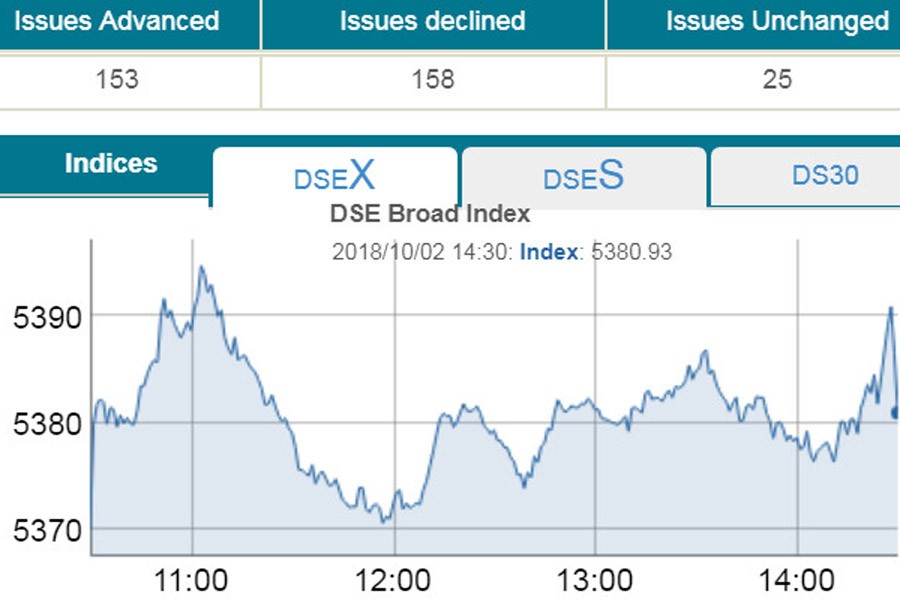 At the end of the session, DSEX, the prime index of the Dhaka Stock Exchange (DSE), went up by 11.02 points or 0.20 per cent to settle at 5,380 over the previous day.