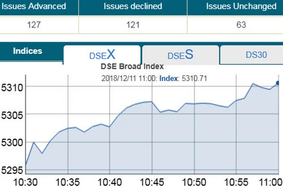 DSEX, the prime index of the DSE, went up by 15.10 points or 0.28 per cent to stand 5,310 points at 11:00am.