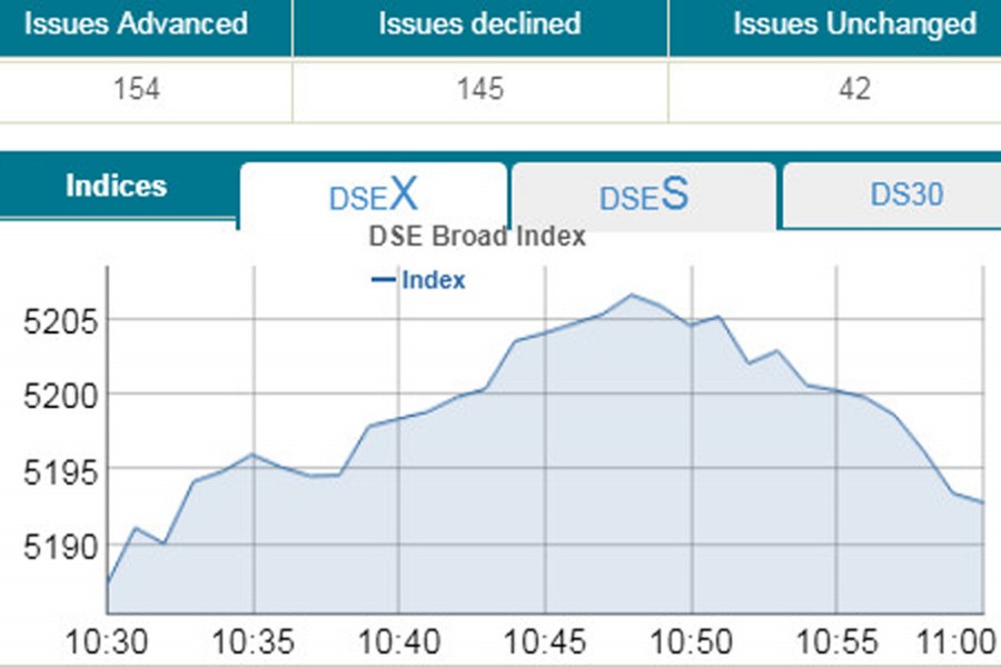 DSEX, the prime index of the DSE, went up by 5.31 points or 0.10 per cent to stand 5,192 points at 11:00am.