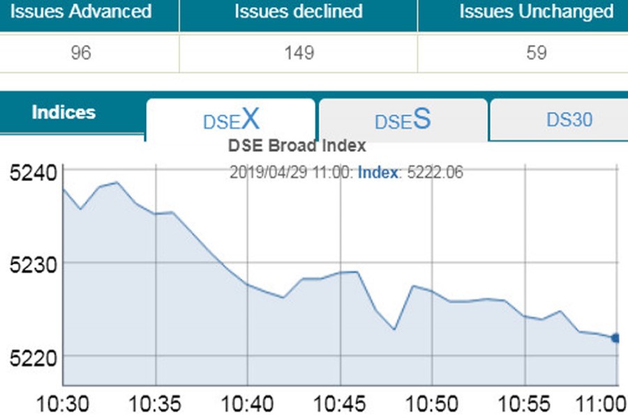 DSEX, the prime index of the DSE, went down by 15.69 points or 0.30 per cent to stand 5,222 points at 11:00am.