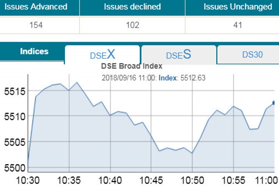 DSEX, the prime index of the DSE, went up by 15.55 points or 0.28 per cent to reach at 5,516 points at 11:00am.