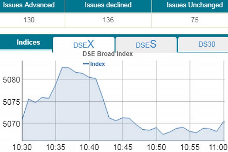 DSEX, the prime index of the DSE, went down by 1.02 points or 0.02 per cent to stand at 5,069 points at 11:00am.