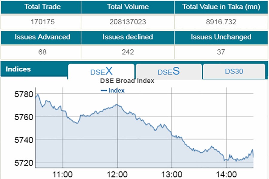 At the end of the session, DSEX, the prime index of the Dhaka Stock Exchange (DSE), settled at six-week low at 5,724, losing 51.30 points or 0.88 per cent over the previous session.