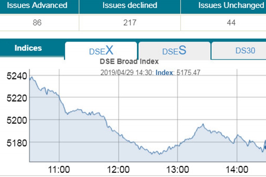 DSEX, the prime index of the Dhaka Stock Exchange (DSE), went down by 62.73 points or 1.20 per cent to settle at 5,175.