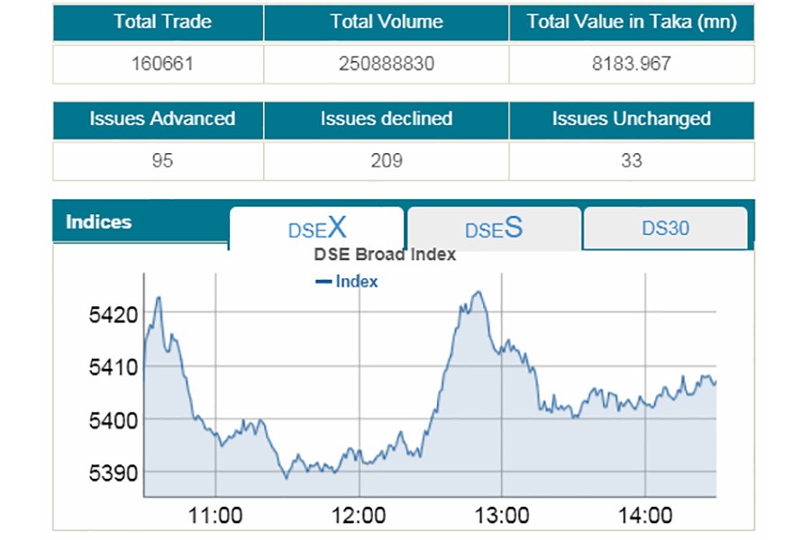 After witnessing volatility almost throughout the trading session, DSEX, the prime index of the Dhaka Stock Exchange (DSE), saw a fractional gain of 0.18 point to settle at 5,407.