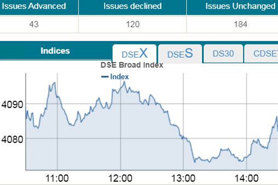 DSEX, the key index of the Dhaka Stock Exchange, went down by 7.36 points or 0.18 per cent to settle at 4,082 over the previous day.