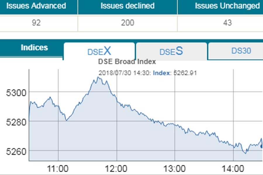 At the end of the session, DSEX, the prime index of the Dhaka Stock Exchange (DSE), went down by 17 points or 0.32 per cent to settle at 5,262. It was the lowest level of DSEX since January 9, 2017.