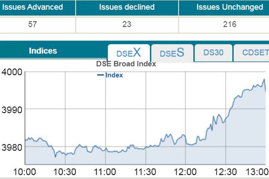 DSEX, the key index of the Dhaka Stock Exchange, went up by 13.13 points or 0.32 per cent to settle at 3,994.