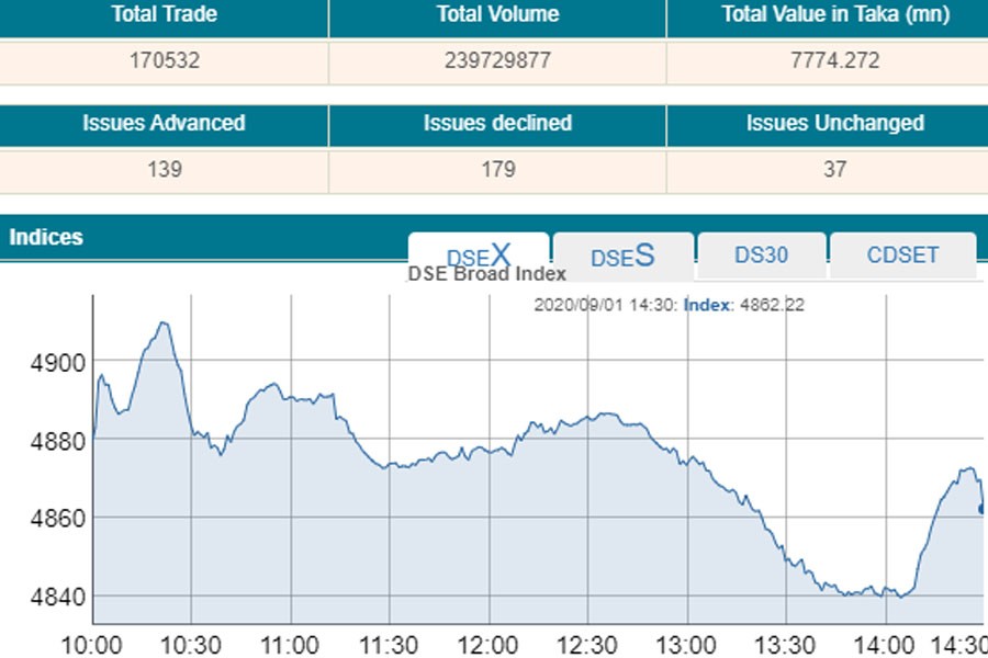 DSEX, the prime index of the Dhaka Stock Exchange (DSE), went down by 16.92 points or 0.34 per cent to settle at 4,862 points, after gaining 117 points in the past four straight sessions.