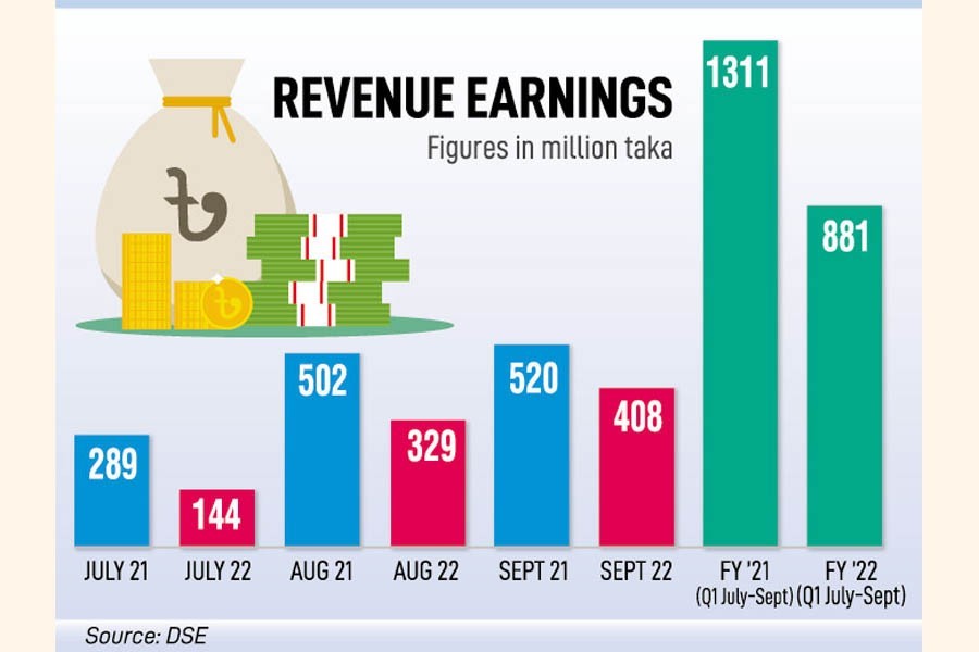 The government bagged revenue of Tk 881 million in the July-September period of fiscal 2022-23, down from Tk 1,311 million in the same period of the previous fiscal year, according to data from the DSE.