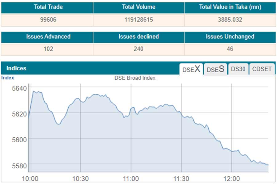 Following the previous day’s sharp gain, the market opened lower and the key index of the Dhaka Stock Exchange (DSE) went down by 29 points or 0.51 per cent to 5,586, after two hours of trading at 12:00 noon, when the report was filed.