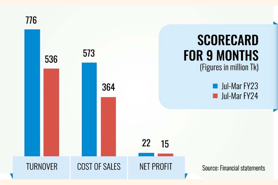 The company's sales have plummeted 31 per cent year on year to Tk 536 million in nine months through March this year.