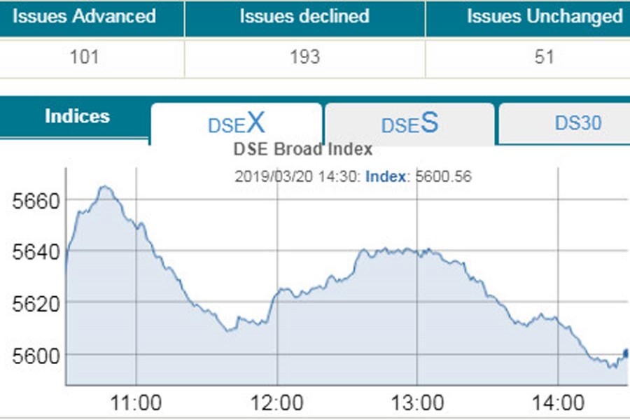DSEX, the prime index of the Dhaka Stock Exchange, went down by 30.37 points or 0.54 per cent to finish at 5,600. It was the lowest level of DSEX since January 03, 2019.