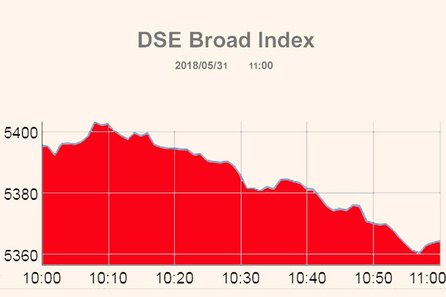 DSEX, the prime index of the DSE, went down by 32 points or 0.58 per cent to reach at 5,364 points at 11:00am.