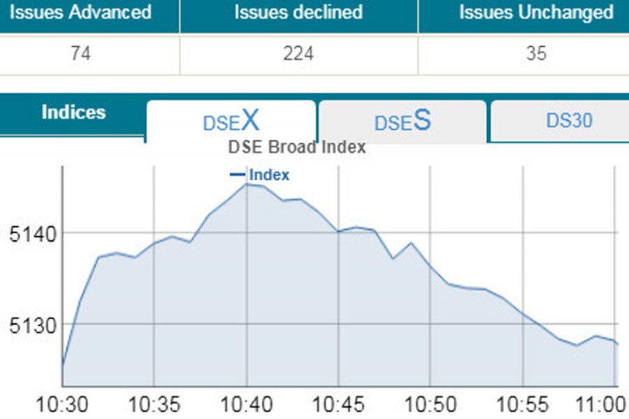 Of the issues traded till then, 88 advanced, 160 declined and 54 remained unchanged on the DSE trading floor.