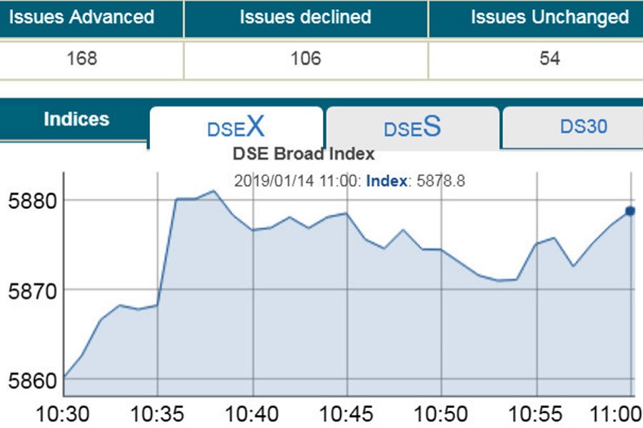 DSEX, the prime index of the DSE, went up by 18.05 points or 0.31 per cent to stand 5,878 points at 11:00am.