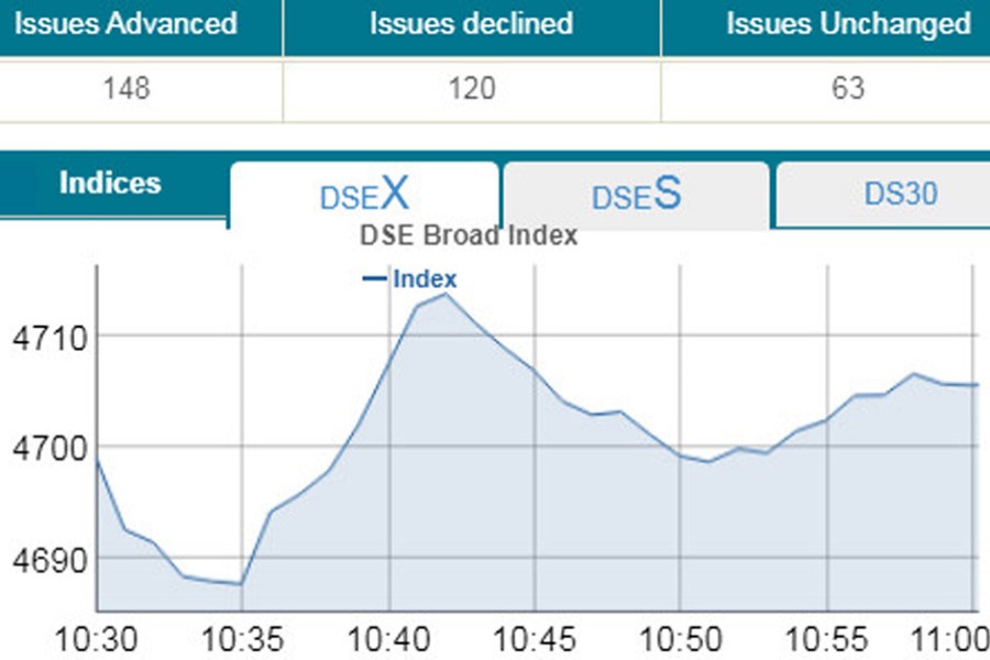 DSEX, the prime index of the DSE, went up by 4.38 points or 0.09 per cent to stand at 4,703 points at 11:00am.