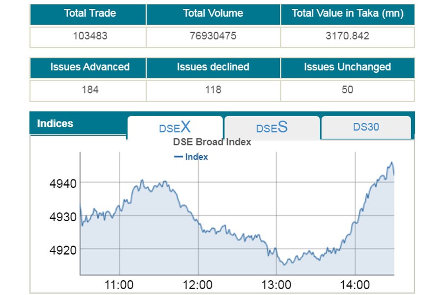 DSEX, the prime index of the Dhaka Stock Exchange, went up by 8.34 points to settle at 4,942, snapping a recent sharp decline.