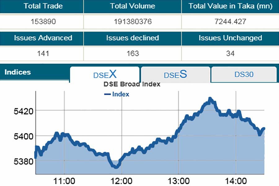 At the end of the session, DSEX, the prime index of the Dhaka Stock Exchange (DSE) went up by 24 points or 0.44 per cent to settle at 5,405. DSEX crosses 5,400-mark after six weeks.