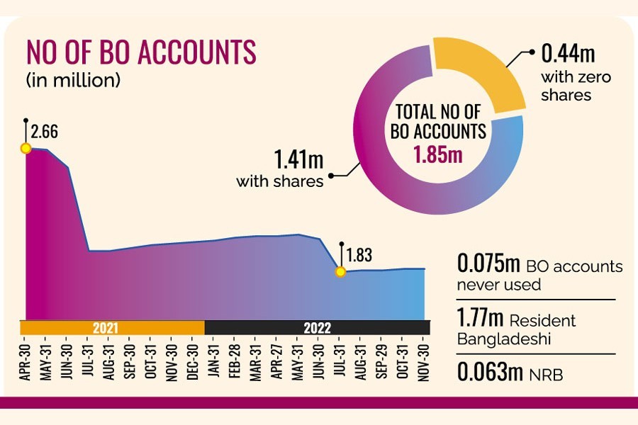 Almost 24 per cent of the existing 1.85 million BO accounts have zero shares, according to the data from the Central Depository Bangladesh Ltd (CDBL), which preserves information about individual and institutional investors.