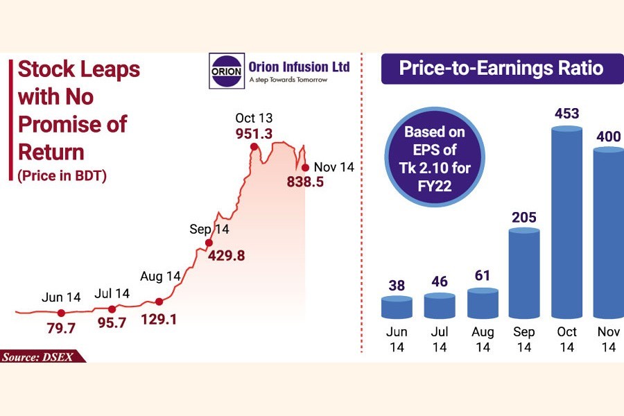 The overall P/E ratio of the DSE, which is around 15, indicates that Orion Infusion's was way above what could be deemed normal, said a merchant banker, requesting not to be named.