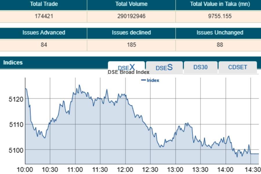 DSEX, the key index of the Dhaka Stock Exchange (DSE), went down by 16.71 points or 0.32 per cent to settle at below the 5,100-mark to 5,098, after gaining more than 40 points in the previous day.