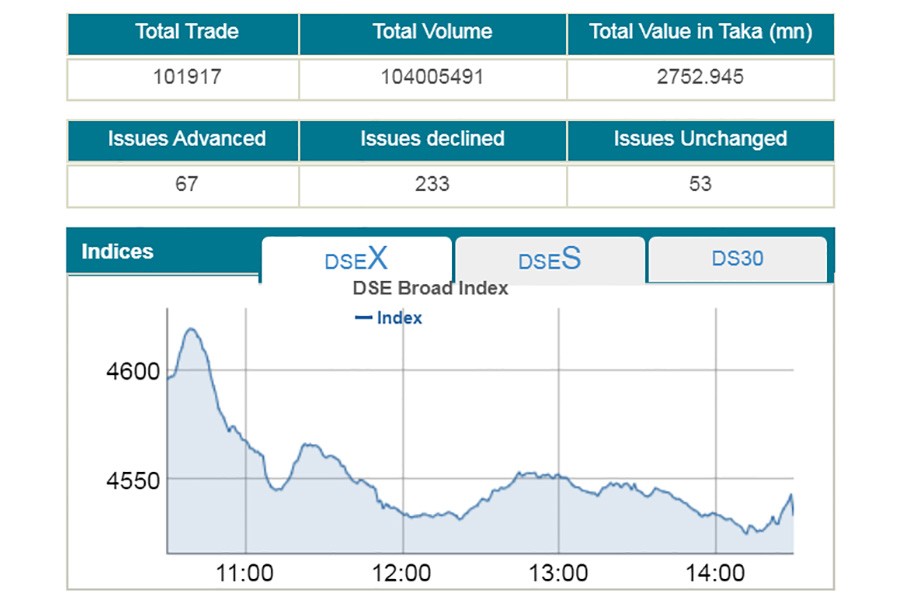 DSEX, the prime index of the Dhaka Stock Exchange, went down by 62.25 points or 1.35 per cent to close at nearly 40 months low at 4,533 since August 31, 2016.
