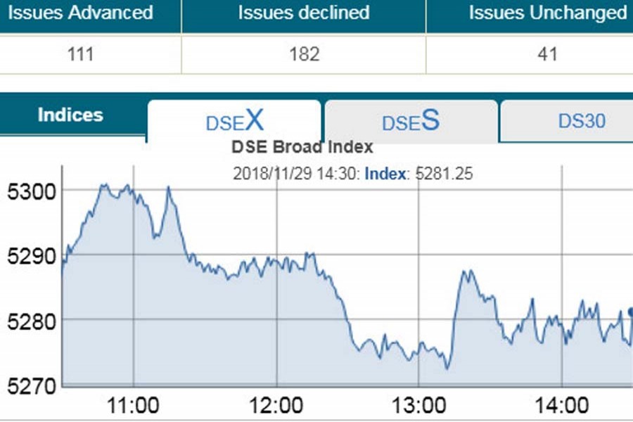 At the end of the session, DSEX, the prime index of the Dhaka Stock Exchange (DSE), settled at 5,281, losing 5.47 points or 0.10 per cent over the previous day.