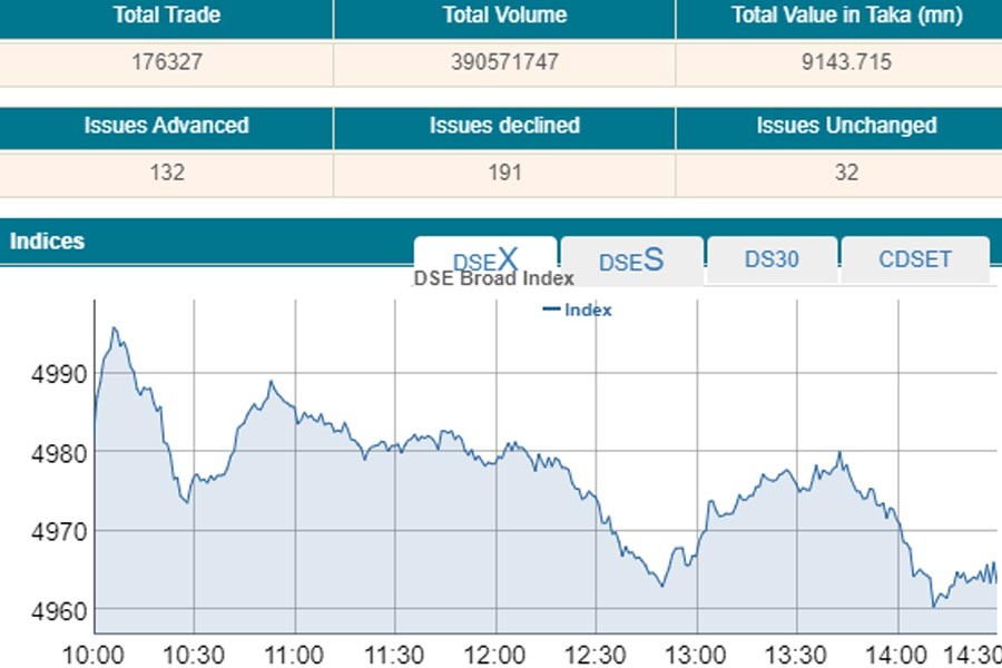 Finally, DSEX, the prime index of the Dhaka Stock Exchange (DSE), went down by 19.08 points or 0.38 per cent to settle at 4,963.