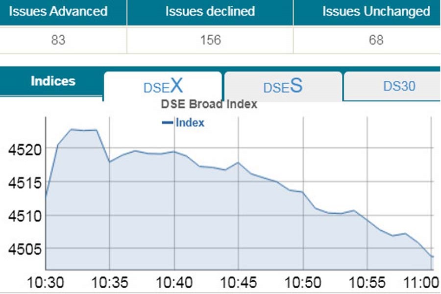 DSEX, the prime index of the DSE, went down by 9.51 points or 0.21 per cent to stand at 4,502 at 11:00am.