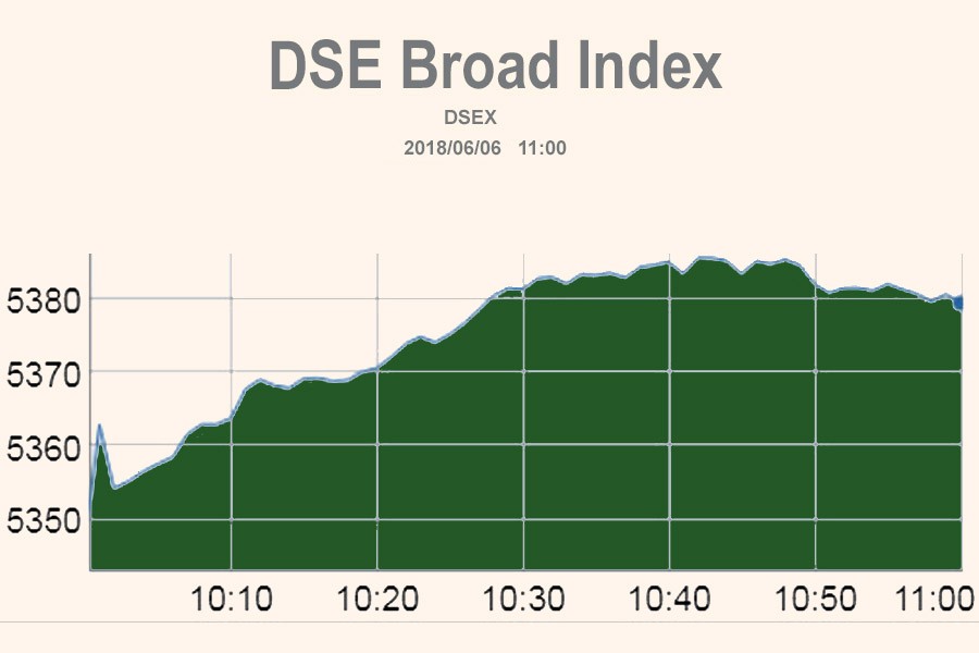 DSEX, the prime index of the DSE, went up by 33 points or 0.62 per cent to reach at 5,380 points at 11:00am.