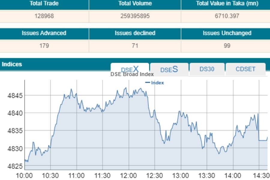 DSEX, the benchmark index of the Dhaka Stock Exchange (DSE), went up by 10.83 points or 0.22 per cent to settle at 4,833, after losing 84 points in the past four straight sessions.
