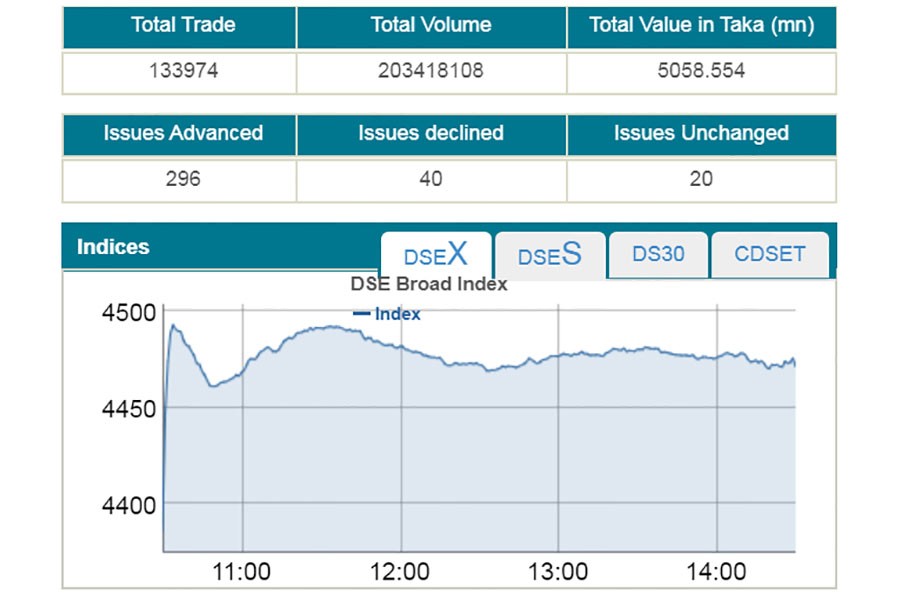 DSEX, the prime index of the Dhaka Stock Exchange (DSE), went up by 85.96 points or 1.96 per cent to settle at 4,471, after losing 121 points in the past five sessions.