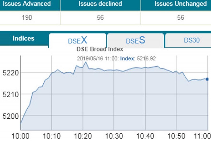 The DSEX went up by 23.94 points or 0.46 per cent to reach at 5,219 points at 11:00am.