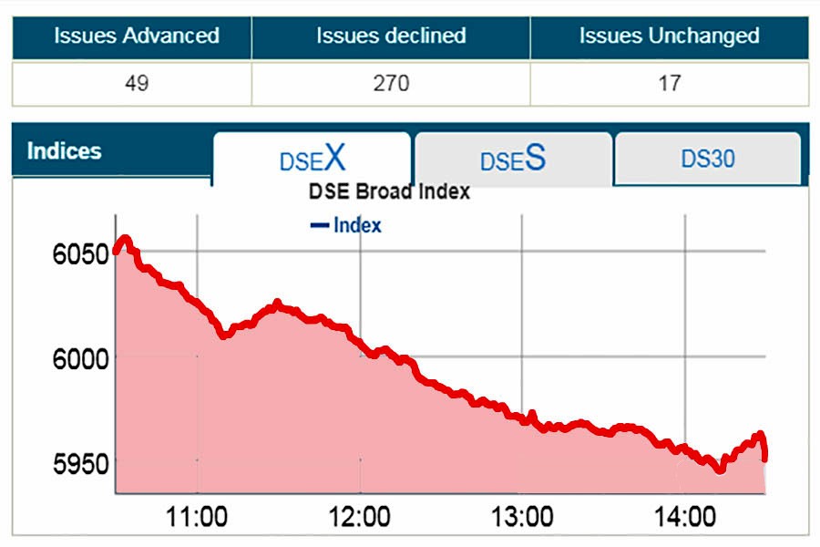 DSEX, the prime index of the Dhaka Stock Exchange (DSE), went down by 99.44 points or 1.64 per cent to come down below 6,000-mark to settle at 5,950.