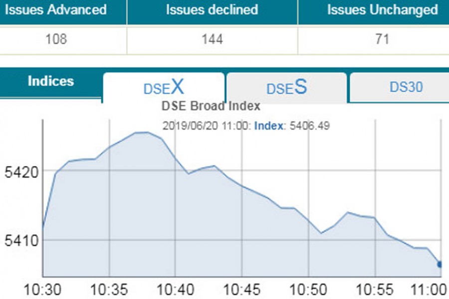 DSEX, the prime index of the DSE, went down by 4.80 points or 0.08 per cent to stand 5,406 points at 11:00am.