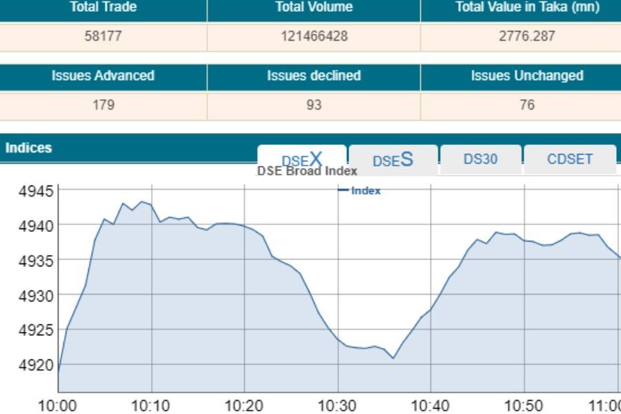 DSEX, the prime index of the DSE, went up by 14.12 points or 0.28 per cent to reach 4,932 points at 10:30 am.