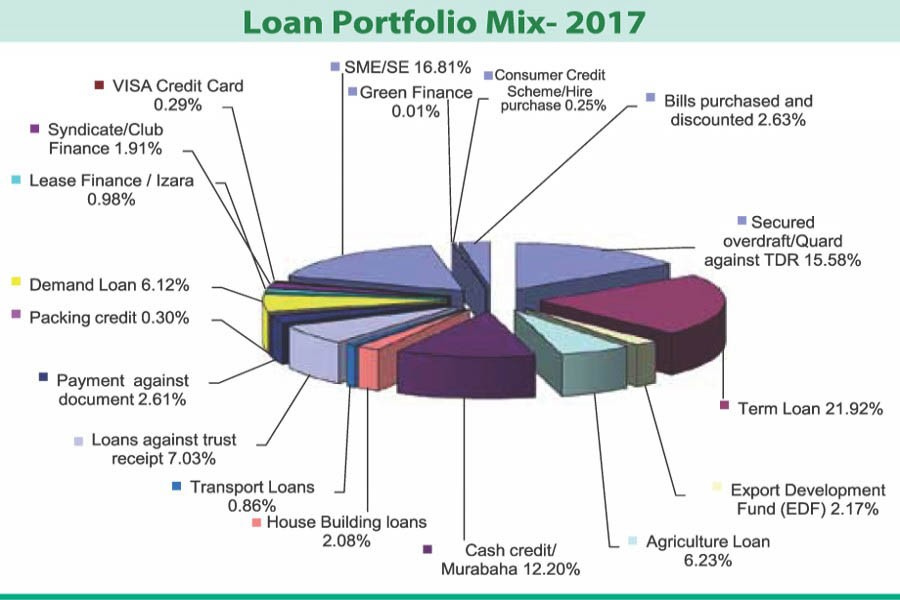 As per the loan portfolio mix-2017 of the bank, term loan accounted for 21.92 per cent, SME 16.81 per cent, secured overdraft against TDR (term deposit receipts) 15.58 per cent and cash credit/murabaha 12.20 per cent of the total advances.