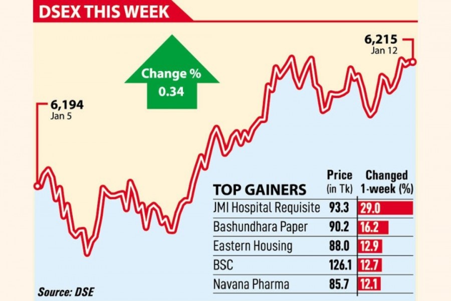 DSEX, the benchmark index of the Dhaka Stock Exchange (DSE), settled at 6,215, with a gain of 21.09 points, or 0.34 per cent. The index lost 12.85 points in the week before.