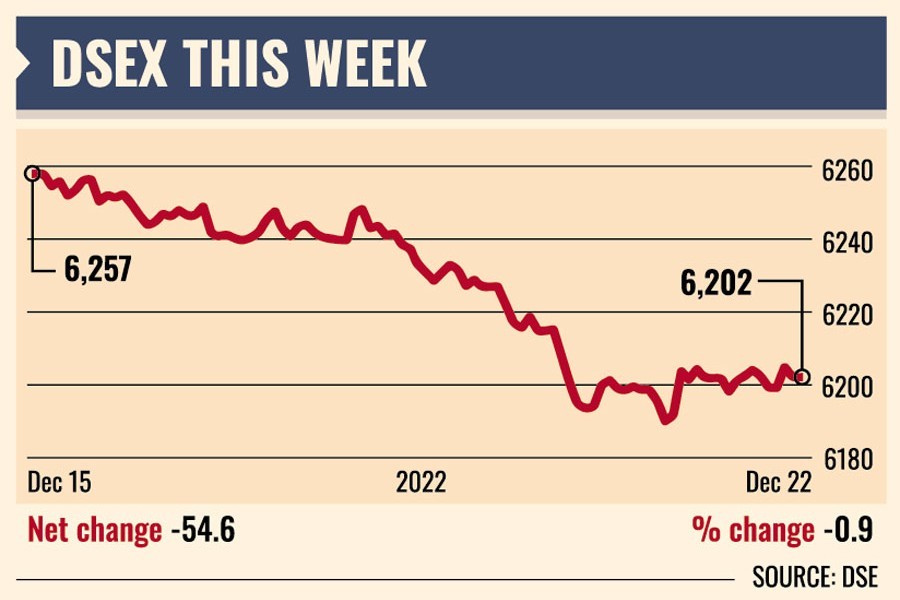 Of the five trading days this week, the first four sessions ended in the red while the last one managed to bounce back. DSEX, the benchmark index of the Dhaka Stock Exchange (DSE), settled the week 54.61 points, or 0.87 per cent, lower at 6,202 after gaining 29 points in the week before.